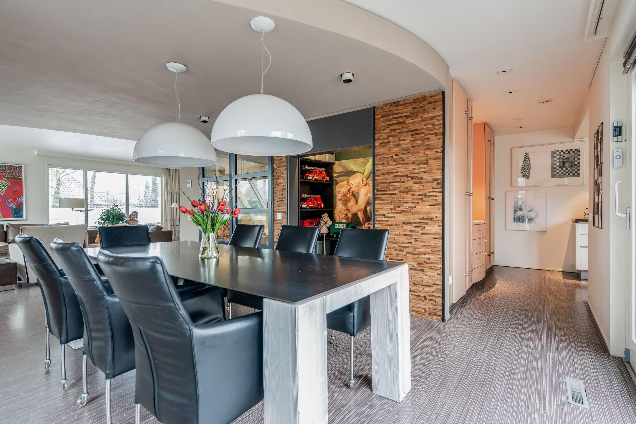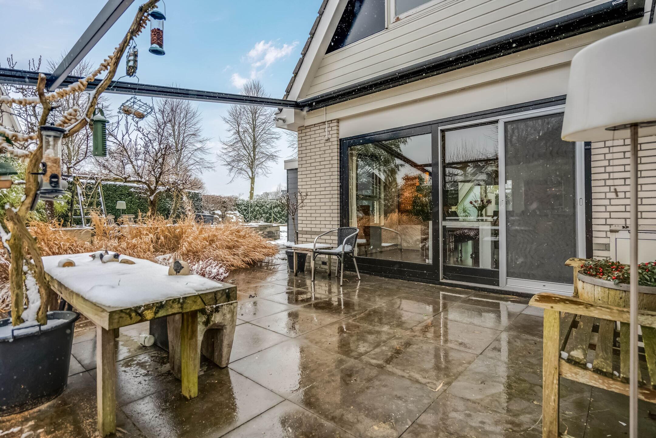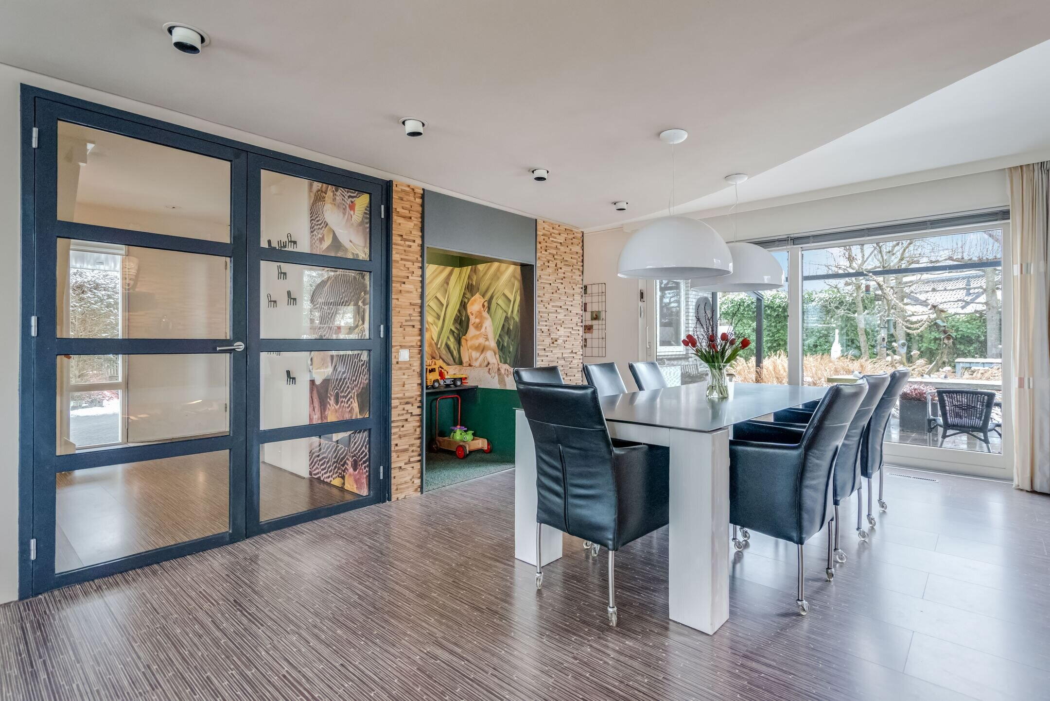 Begane grond: u betreedt de woning via de ruime hal/entree met toilet. De speels ingedeelde L-vormige woonkamer is maar liefst 63 m² groot en voorzien van een gashaard, bamboevloer en een serre. Via de schuifpui bereikt u het overdekte veranda-terras. Aan de achterzijde van de woning bevindt zich de goed uitgeruste keuken met veel kastruimte, aansluitend de bijkeuken met doorgang naar de geïsoleerde garage.