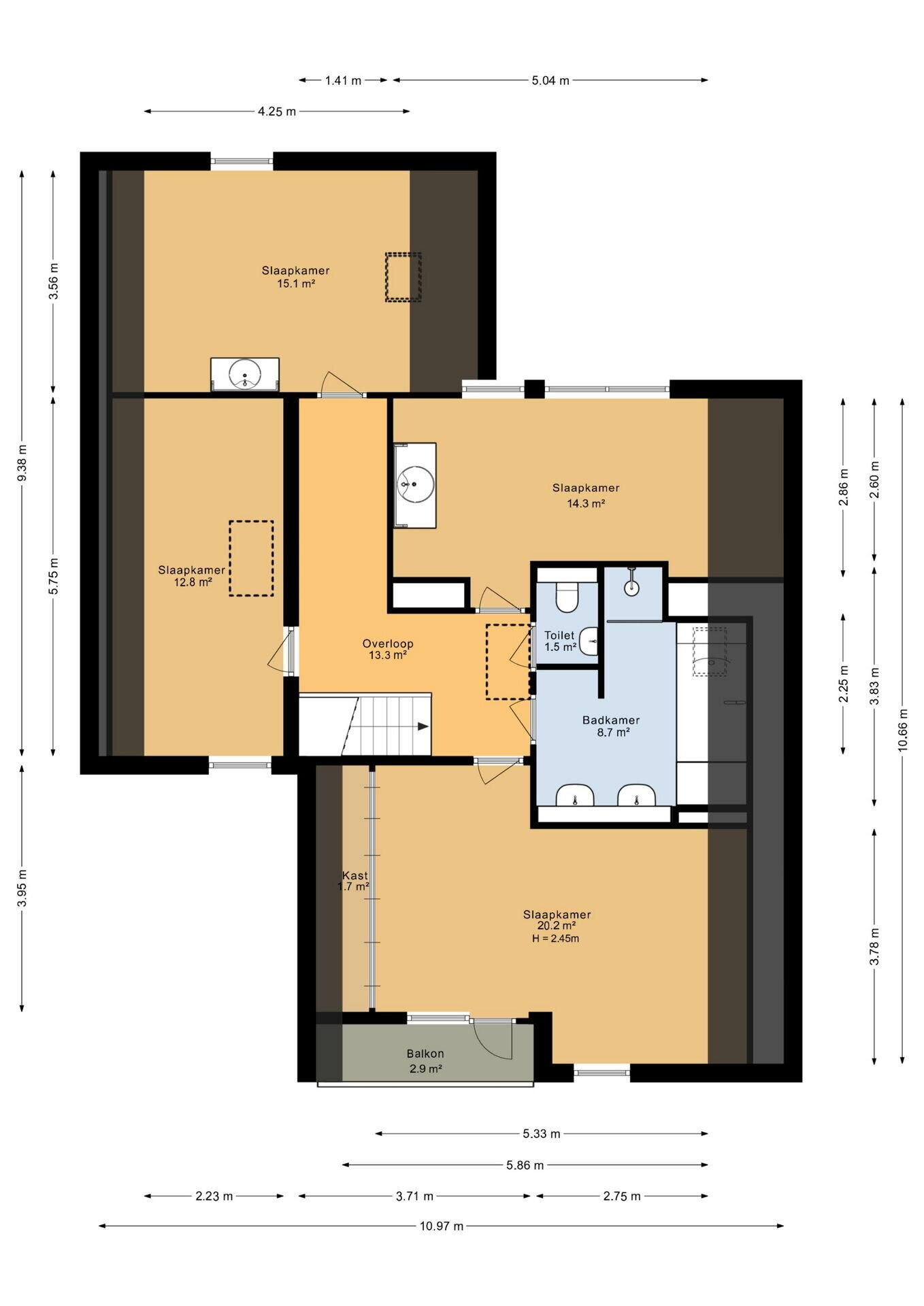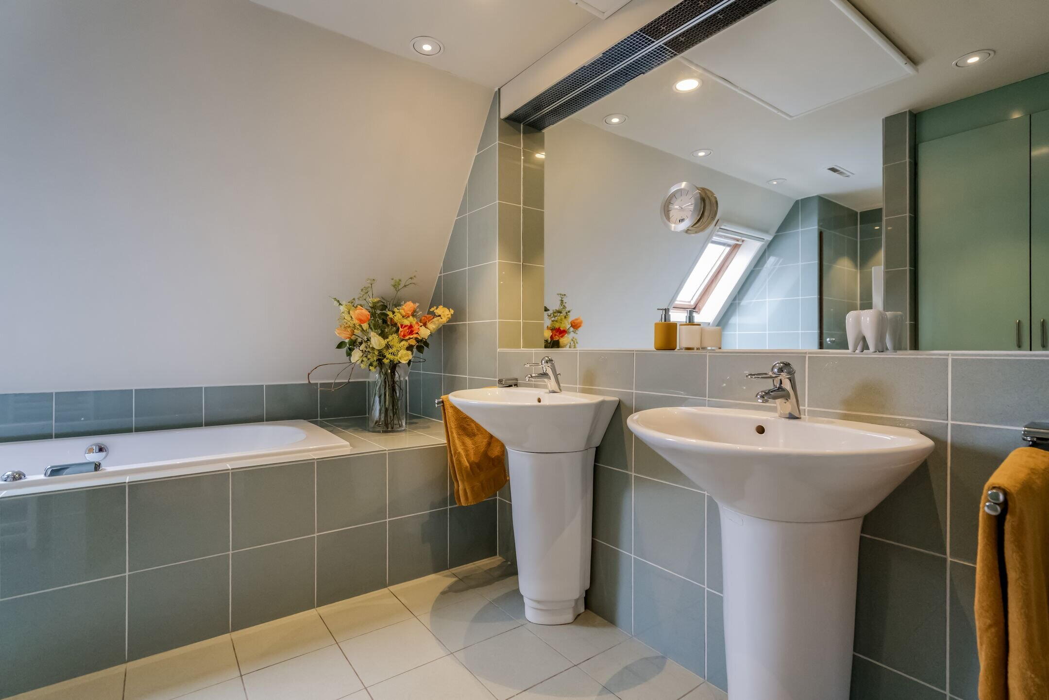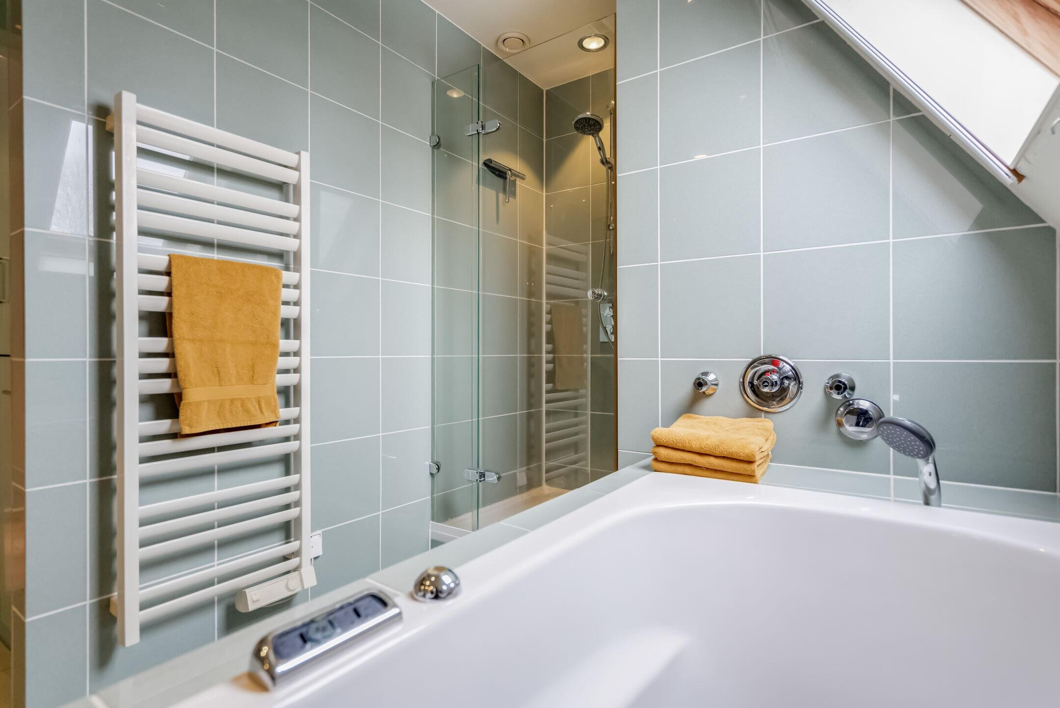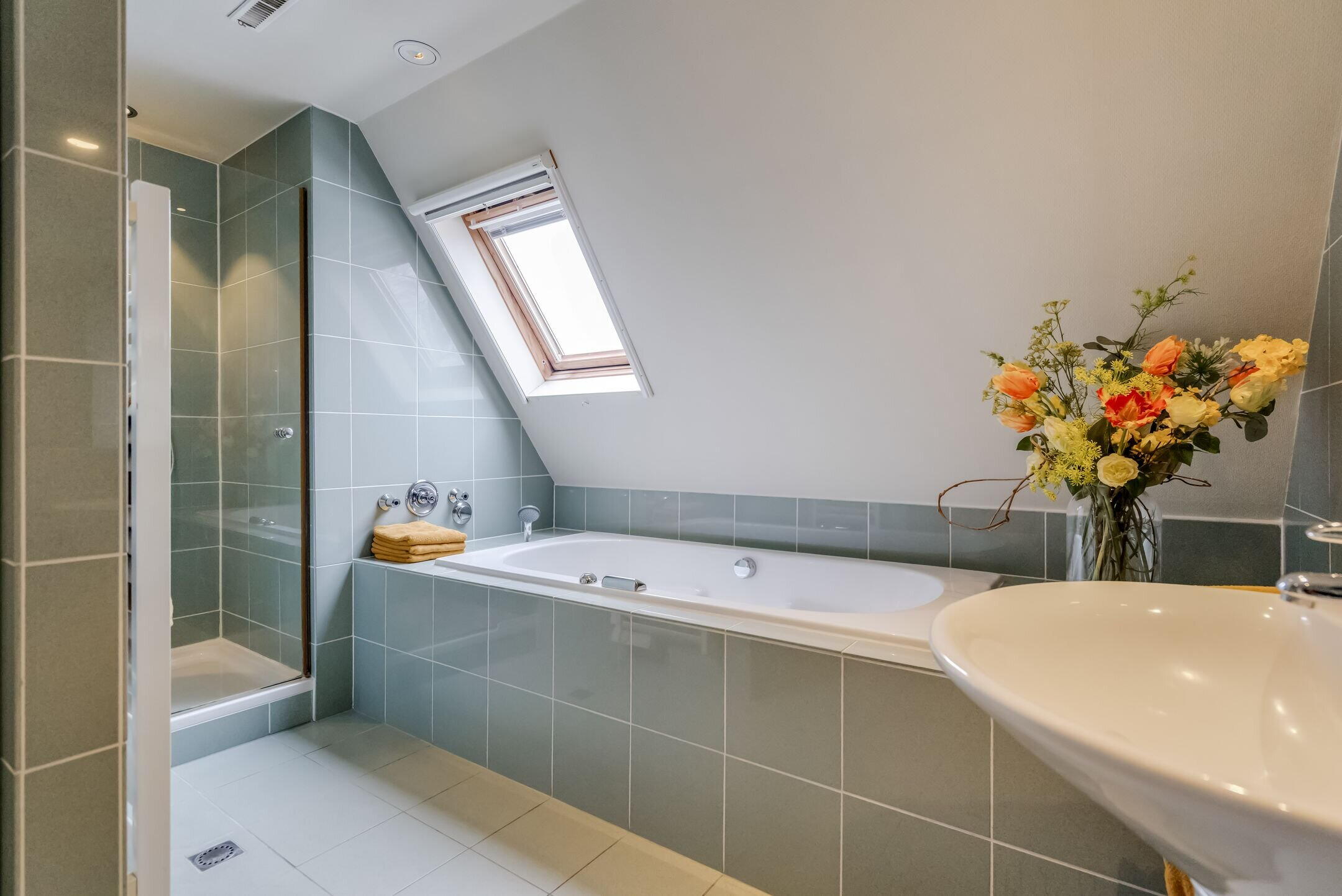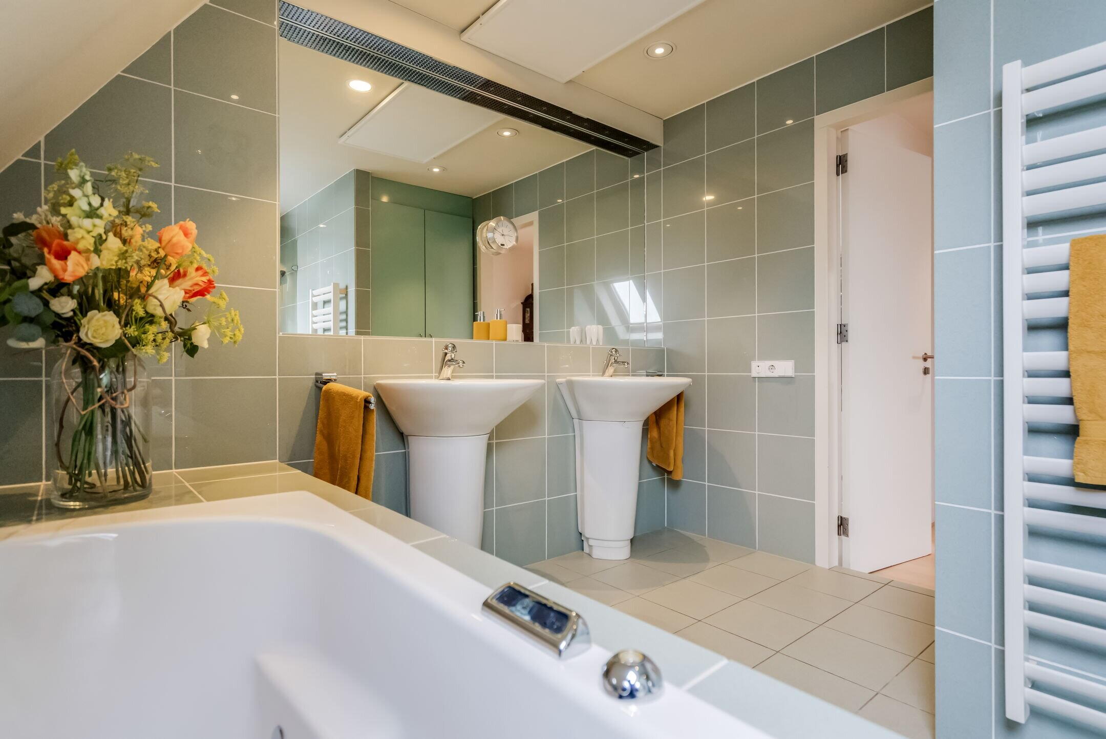Eerste verdieping: vanaf de ruime overloop zijn vier zeer ruime slaapkamers bereikbaar (respectievelijk ca. 13 m², 14 m², 15 m² en 20 m²) voorzien van vaste kasten wanden waarvan 2 met wastafelmeubel. De grootste slaapkamer beschikt over toegang tot een balkon. Daarnaast bevinden zich op deze verdieping een separate toiletruimte en een ruime, moderne badkamer met twee wastafels, inloopdouche en ligbad.